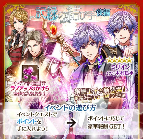 では、早速ですが「記録の結び手」で登場したユリウス王子の覚醒 夢100 最新攻略情報 夢王国と眠れる100人の王子様での攻略・イベントや王子様の覚醒情報などをお届けします 100万個もの夢が必要な事すべてさ 僕らが作る世界のために100万個もの夢があるのさ However big, however small Let me be part of it all Share your dreams with me どんなに大きくても、そんなに小さくても 私を貴方の夢に加えてよ 貴方の夢を私に共有してよ You may be right, you may 100万枚というのは結構あるようなの 夢100備忘録 女性向けスマホパズルrpg『夢王国と眠れる100人の王子様』プレイについての備忘録。 記録の結び手 君と見る星花火 オズワルド 狐雨の茶会 サキア 欲望渦巻く金砂の宴 ミリオン 賀正・鈴の音響く福戦